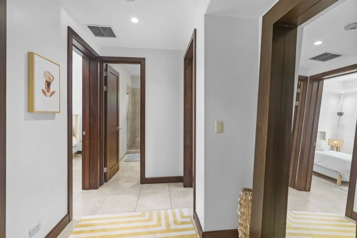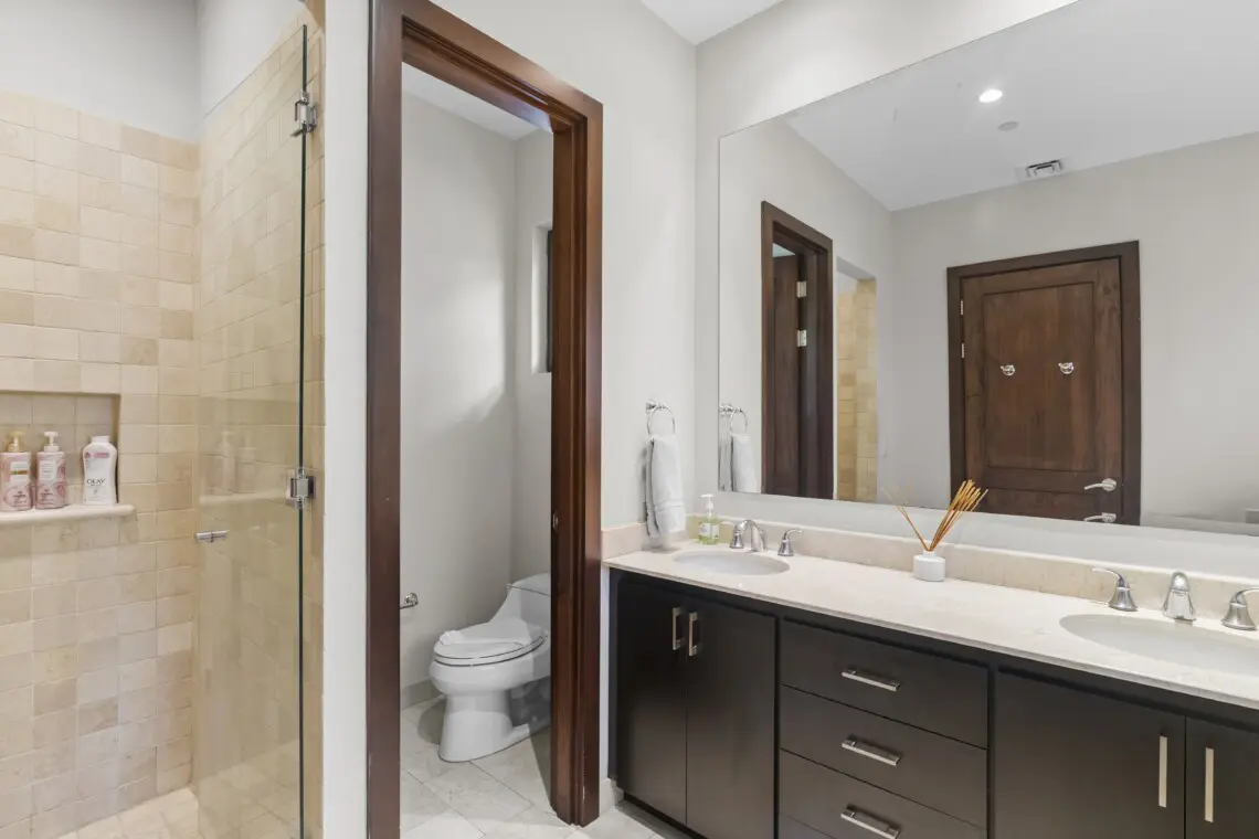 Note that the two queen bedrooms share a bathroom with shower stall and large vanity. There is also a half bath just inside the condo’s main entry, for guests.