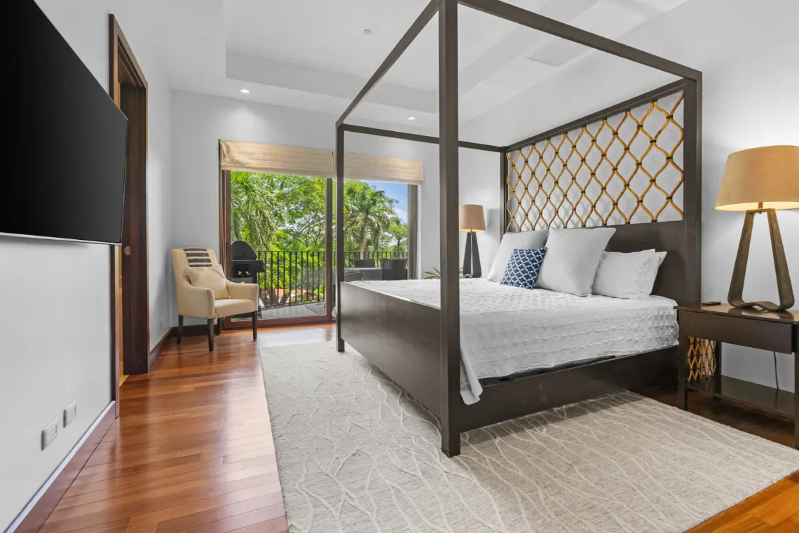 Primary Bedroom – King bed, 55″ Smart TV, balcony access, ensuite bathroom with tub, shower stall and double vanity plus a walk-in closet