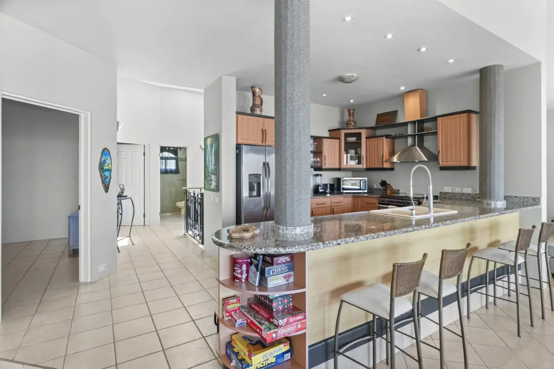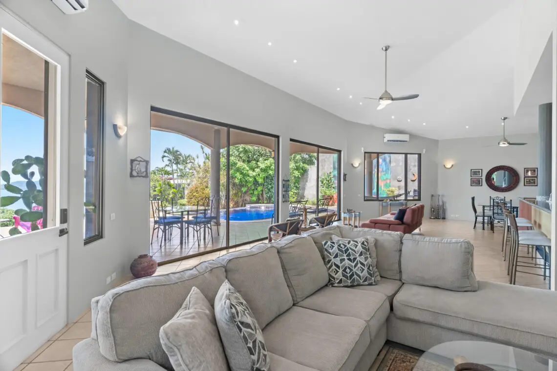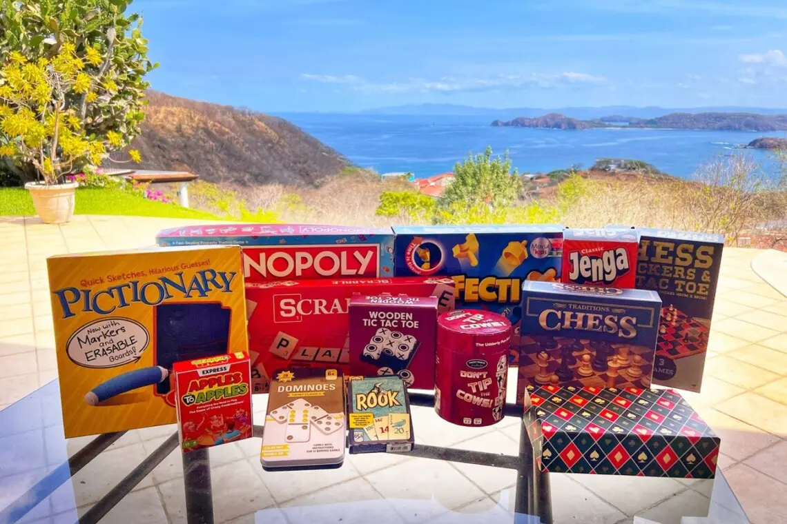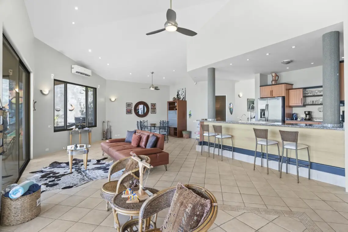 The living and dining areas are on one main level and then just 1 step up brings you to the raised kitchen, bedrooms, and bathrooms. The home has 3 bedrooms – 2 king beds and 1 queen – plus 2 full bathrooms. Outside, the large, covered outdoor space surrounds the pool and offers lots of seating options plus a gas BBQ. There are lots of board games and books to keep you entertained and connected during your vacation.