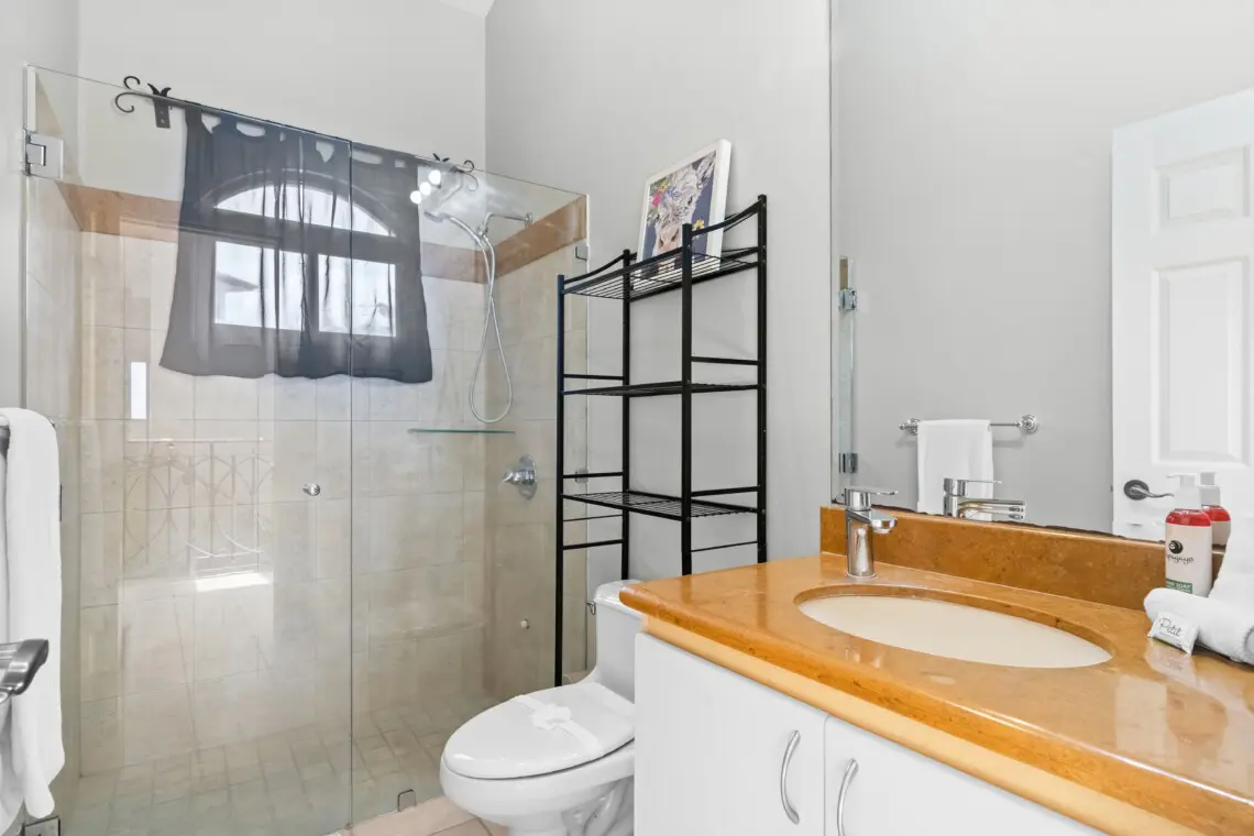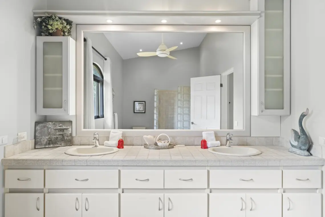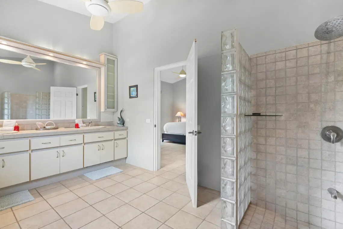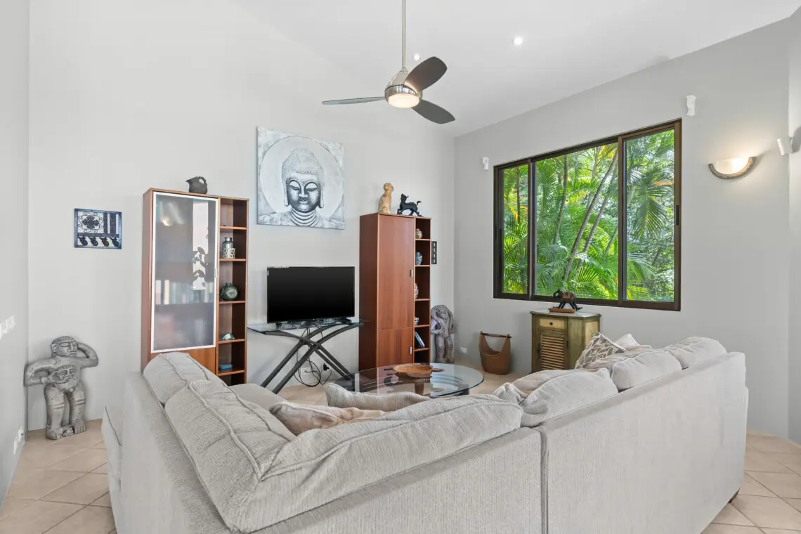 The living and dining areas are on one main level and then just 1 step up brings you to the raised kitchen, bedrooms, and bathrooms. The home has 3 bedrooms – 2 king beds and 1 queen – plus 2 full bathrooms. Outside, the large, covered outdoor space surrounds the pool and offers lots of seating options plus a gas BBQ. There are lots of board games and books to keep you entertained and connected during your vacation.