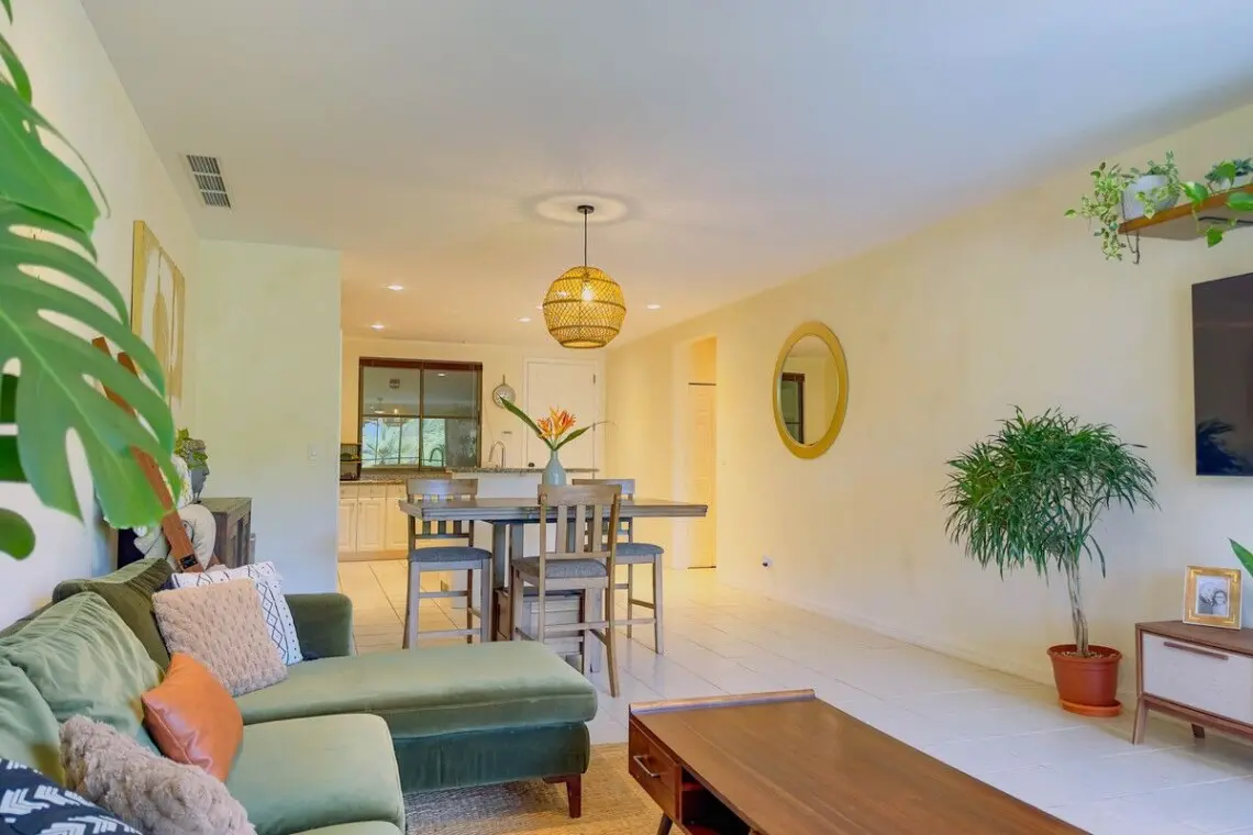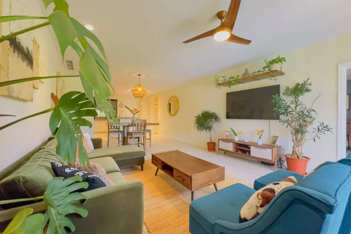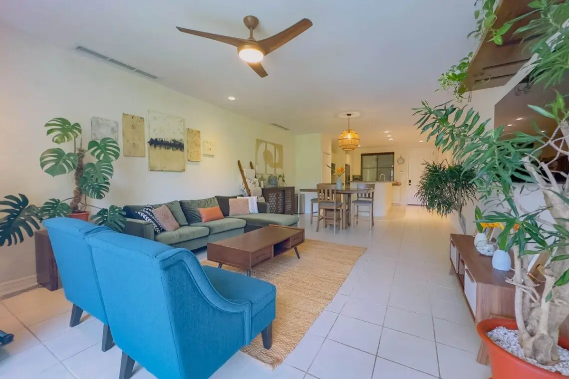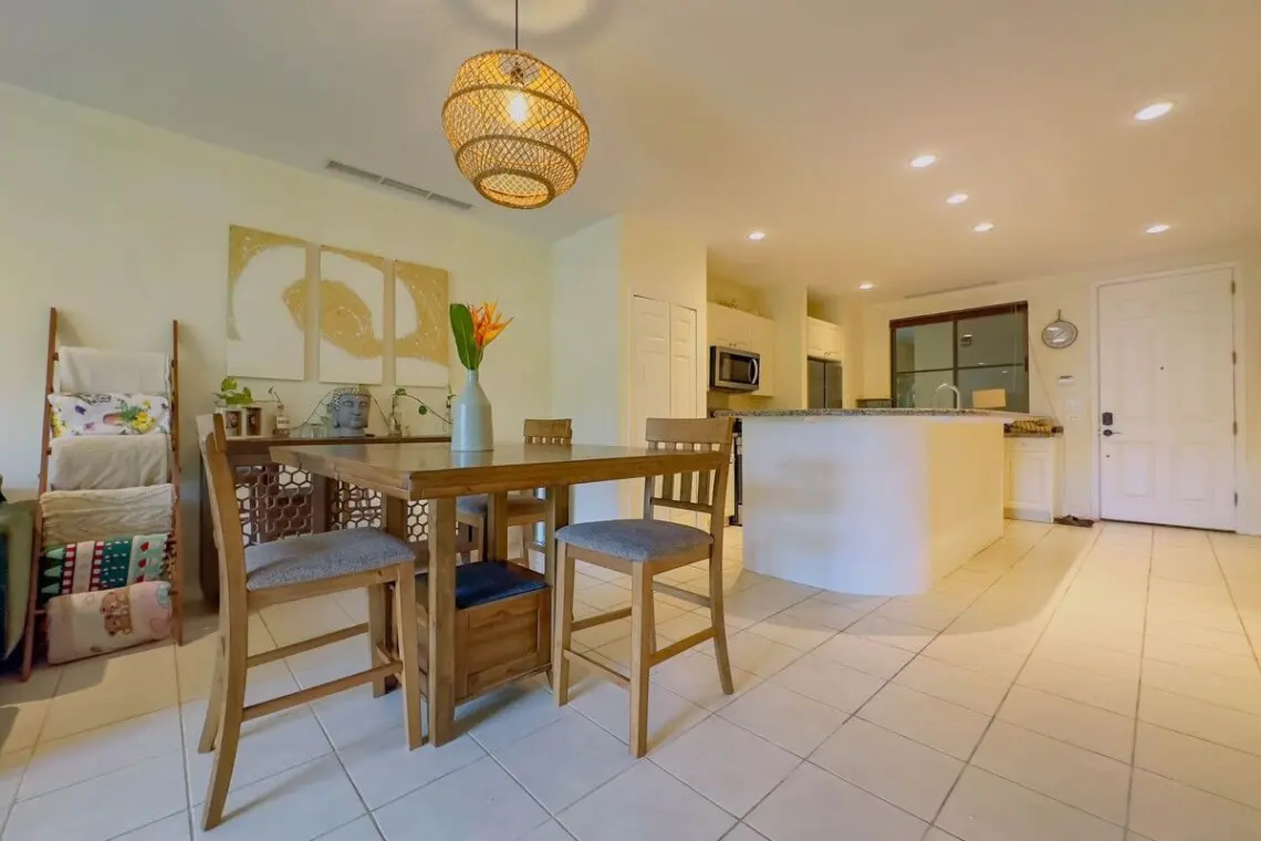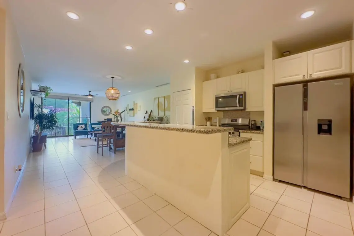 The condo boasts beautiful morning sunshine views from the expansive covered balcony, complete with comfortable outdoor lounging and dining furniture, perfect for enjoying the warm, tropical mornings or hosting alfresco meals. Inside, the space features a sleek mid-century style, with elegant wood furniture and updated appliances that seamlessly blend modern comfort with timeless design. The updated bathrooms further enhance the condo’s appeal, offering both style and functionality.