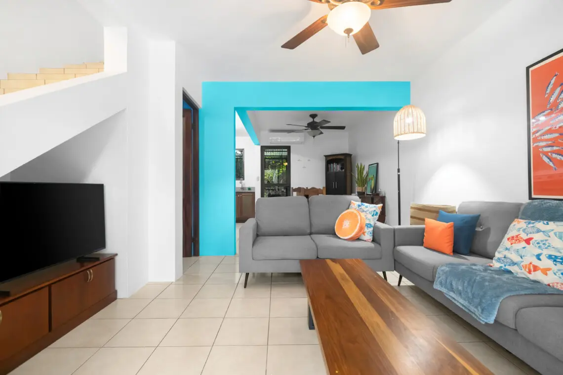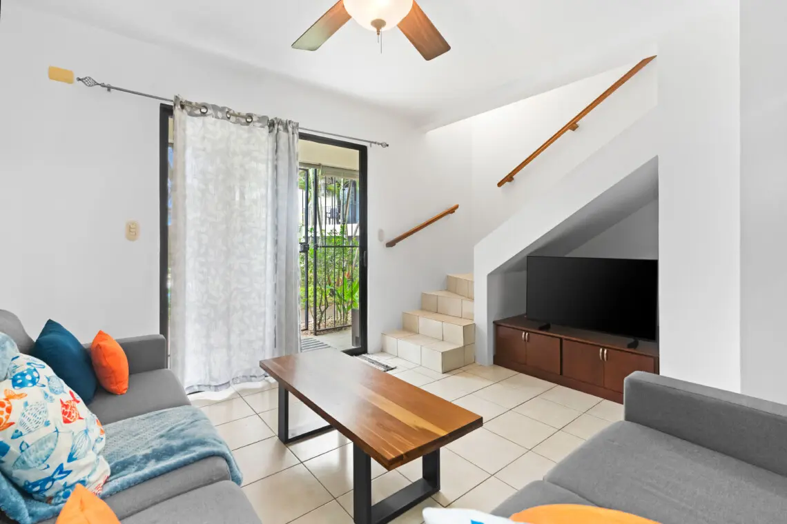 Tropical Dreams 7 is a stylish two-level townhouse offering the perfect mix of comfort and tropical charm. The open-concept main floor features a bright living area with a 42” Smart TV, a dining table for four, and a fully equipped kitchen with full-size appliances — plus a convenient half bath and in-unit laundry.