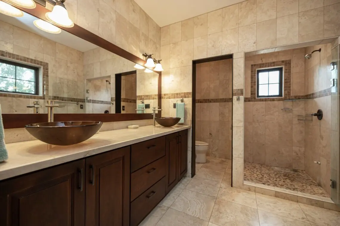 Bedroom 1 – King bed, Smart TV, ensuite bathroom with shower, large closet, and pool access.